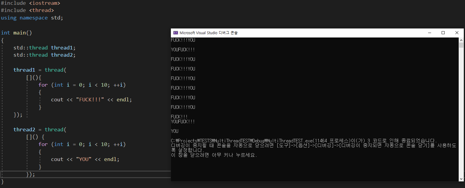 멀티 쓰레드로 만드는 게 엄청 어려울 줄 알았는데, 의외로 사용방법 자체는 쉬웠다. 실행화면도 보면 두 개의 스레드가 독립적으로 동작하고 있음을 알 수 있다.